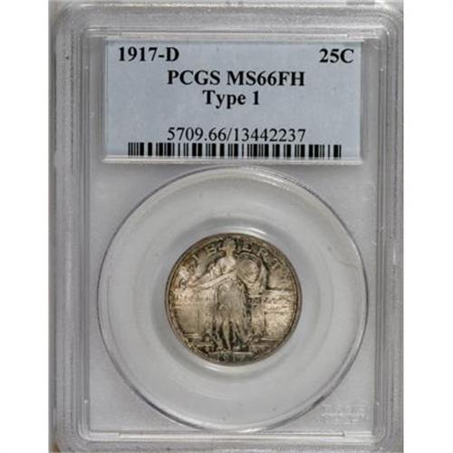 <B>1917-D 25C Type One MS66 Full Head PCGS.</B></I> A frosty Premium Gem with brilliant silver-white centers and splashes of iridescent toning along the borders and near the devices on each side. All three of the 1917 Type One issues are easily located in any desired grade, though sharply struck coins such as the present piece offer increased desirability. PCGS has graded 17 finer Full Head examples (10/07).<BR><BR><B>Coin Engraver:</B> Hermon A. MacNeil<BR><BR><b>Shipping:</b> Coins & Currency (<a target="_blank" href="http://www.heritageauctions.com/common/shipping.php">view shipping information</a>)
