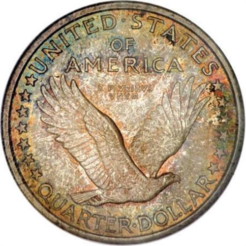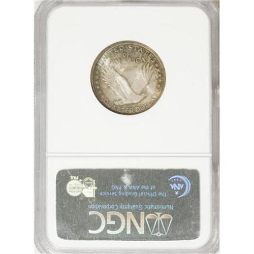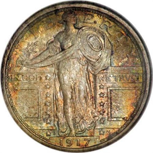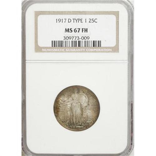 <B>1917-D 25C Type One MS67 Full Head NGC.</B></I> The Type One 1917-D with a Full Head is generally available in grades through MS66, but becomes much more elusive in MS67, and virtually unobtainable in MS68 and above. This is apparent from the population data, that indicates just 34 pieces certified by NGC and PCGS combined at the MS67 Full Head level, and only two rated higher (10/07). The sharp strike of the present example transcends the fully detailed head of Liberty to include sharp definition on all of the rivets, as well as on the horizontal and vertical lines of the inner shield, and the eagle's torso. Lustrous surfaces are bathed in a melange of orange, lavender, cobalt-blue, gray, and lime-green patination, and are virtually devoid of any mentionable marks. A highly attractive piece that is sure to please the Standing Liberty quarter aficionado. NGC Census: 17 in 67, 2 finer (10/07). <BR><I>From The Hoffy Collection, NGC's #3 Registry Collection of Standing Liberty Quarters.</B></I><BR><BR><B>Coin Engraver:</B> Hermon A. MacNeil<BR><BR><b>Shipping:</b> Coins & Currency (<a target="_blank" href="http://www.heritageauctions.com/common/shipping.php">view shipping information</a>)