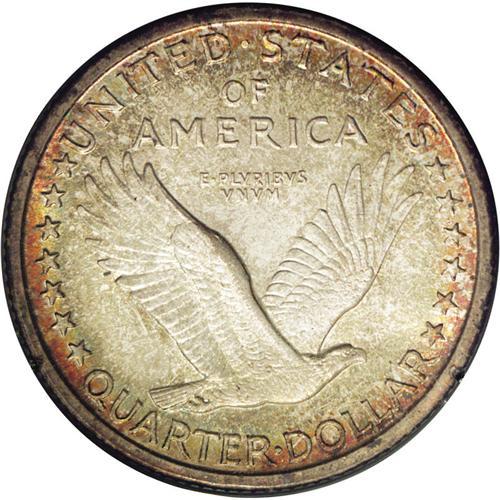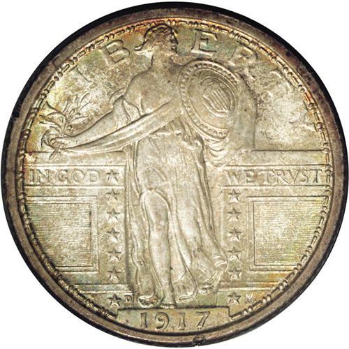 <B>1917-D<25C> Type One MS67 PCGS.</B></I> Mottled silver-gray toning with tinges of sunset-orange and forest-green at the borders, the reverse contributing a dash of magenta, beneath which brilliant luster issues forth. Extremely close to a full head (and perhaps there by today's interpretation), this well struck coin also boasts full shield rivets, with no observable distractions on either side. In an old-style PCGS "rattler" holder. Unsurpassed quality, with two specimens at PCGS, and none finer (3/06).