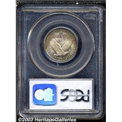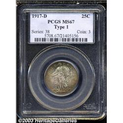 1917-D 25C Type One MS67 PCGS. While not an especially scarce issue per se, in Superb condition this is a significant offering for the collector of Standing Liberty quarters. Every detail is fully brought up on each side and there are no abrasions that we could find with a magnifier. Both sides are beautifully toned with pale blue centers and fabulous golden-rose and lime-green peripheries. That is just a brief sketch or impression of what this coin looks like, but nothing can really substitute for in-person viewing. Population: 2 in 67, 0 finer (10/03). Important notice: Heritage usually auctions material at the rate of 200-250 lots per hour. On some occasions eBay Live bid software or the Internet may not be able to keep up with the pace of the auction. We recommend placing a realistic absentee bid now as insurance to avoid disappointment. Occasionally the auctioneer may eliminate or reject an eBay Live bid, and the auctioneer may also reopen a lot after the close of the eBay live bidding (usually because we missed an audience bid), and may reject your bid even if it shows you as the winning bidder. By bidding via eBay Live, you agree that Heritage may award the lot to another bidder at its sole discretion under the circumstances described above or any other reasonable circumstances. Also please note that all Heritage lots purchased through eBay Live carry a 20% Buyer's Premium. Please make sure you read the Terms and Conditions before you bid.