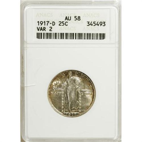 <B>1917-D 25C Type Two AU58 ANACS.</B></I> NGC Census: (58/268). PCGS Population (98/324). Mintage: 6,224,400. Numismedia Wsl. Price for NGC/PCGS coin in AU58: $142. (#5716)<BR><BR><B>Coin Engraver:</B> Hermon A. MacNeil<BR><BR><b>Shipping:</b> Coins & Currency (<a target="_blank" href="http://www.heritageauctions.com/common/shipping.php">view shipping information</a>)