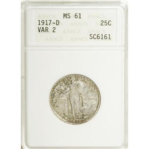 <B>1917-D 25C Type Two MS61 ANACS.</B></I> NGC Census: (11/257). PCGS Population (4/319). Mintage: 6,224,400. Numismedia Wsl. Price for NGC/PCGS coin in MS61: $183. (#5716)<BR><BR><B>Coin Engraver:</B> Hermon A. MacNeil<BR><BR><b>Shipping:</b> Coins & Currency (<a target="_blank" href="http://www.heritageauctions.com/common/shipping.php">view shipping information</a>)