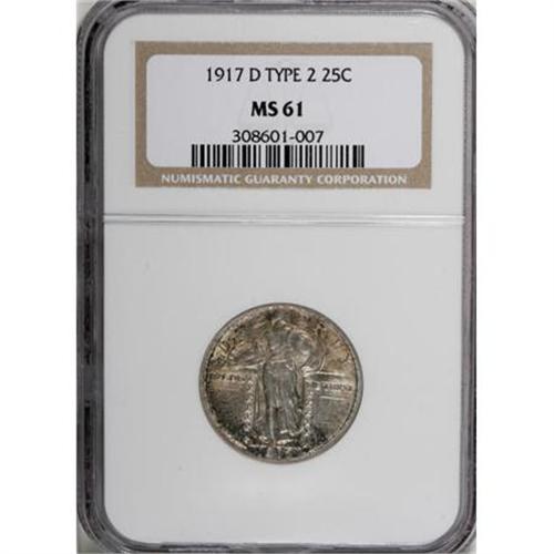 <B>1917-D 25C Type Two MS61 NGC.</B></I> NGC Census: (11/257). PCGS Population (4/328). Mintage: 6,224,400. Numismedia Wsl. Price for NGC/PCGS coin in MS61: $200. (#5716)<BR><BR><B>Coin Engraver:</B> Hermon A. MacNeil<BR><BR><b>Shipping:</b> Coins & Currency (<a target="_blank" href="http://www.heritageauctions.com/common/shipping.php">view shipping information</a>)