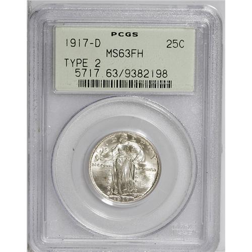 <B>1917-D<25C> Type Two MS63 Full Head PCGS.</B></I> An exquisitely struck specimen with glowing, softly frosted luster and bright, essentially brilliant surfaces. Nearly blemish-free on both sides. The PCGS holder has a pale green label.