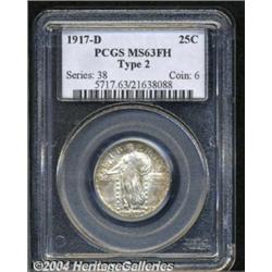 <B>1917-D<25C> Type Two MS63 Full Head PCGS.</B></I> Sienna coloration hovers around the rims and many of the devices of this Select Uncirculated Standing Liberty quarter. While on a technical basis this piece is lacking the marks of a normal MS63, noticeable weakness on many of the central devices keeps this piece from a higher grade. <BR><BR><B>Important notice:</B> Heritage usually auctions material at the rate of 200-250 lots per hour. On some occasions eBay Live bid software or the Internet may not be able to keep up with the pace of the auction. We recommend placing a realistic absentee bid now as insurance to avoid disappointment. Occasionally the auctioneer may eliminate or reject an eBay Live bid, and the auctioneer may also reopen a lot after the close of the eBay live bidding (usually because we missed an audience bid), and may reject your bid even if it shows you as the winning bidder. By bidding via eBay Live, you agree that Heritage may award the lot to another bidder at its sole discretion under the circumstances described above or any other reasonable circumstances. Since eBay bids are not shown to us until we open the lot on the floor, we treat those bids just like floor bids. In most cases the floor responds before the eBay bid is presented to us, due to Internet lag time, so for consistency we have made it a policy that floor bids are always considered first over tie eBay live bids. Also please note that all Heritage lots purchased through eBay Live carry a 20% Buyer's Premium. Please make sure you read the Terms and Conditions before you bid. </span></font></tr></table></td></tr></table>