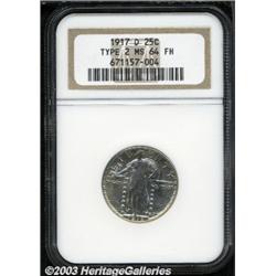 1917-D 25C Type Two MS64 Full Head NGC. Well struck, except for weakness on the date, with essentially untoned surfaces, lovely satin luster, and a single minor contact mark, in the right obverse field. Population: 50 in 64, 21 finer (7/03). Important notice: Heritage usually auctions material at the rate of 200-250 lots per hour. On some occasions eBay Live bid software or the Internet may not be able to keep up with the pace of the auction. We recommend placing a realistic absentee bid now as insurance to avoid disappointment. Occasionally the auctioneer may eliminate or reject an eBay Live bid, and the auctioneer may also reopen a lot after the close of the eBay live bidding (usually because we missed an audience bid), and may reject your bid even if it shows you as the winning bidder. By bidding via eBay Live, you agree that Heritage may award the lot to another bidder at its sole discretion under the circumstances described above or any other reasonable circumstances. Also please note that all Heritage lots purchased through eBay Live carry a 20% Buyer's Premium. Please make sure you read the Terms and Conditions before you bid.