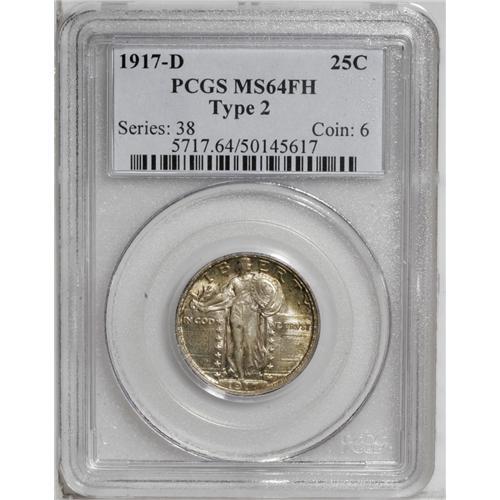 <B>1917-D<25C> Type Two MS64 Full Head PCGS.</B></I> Choice with lovely luster and russet toning that surrounds a small dove-gray center. The strike is bold and the overall eye appeal is high.