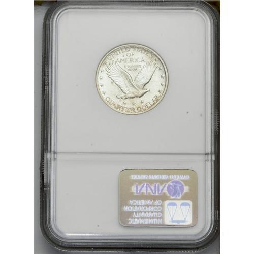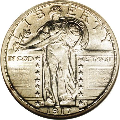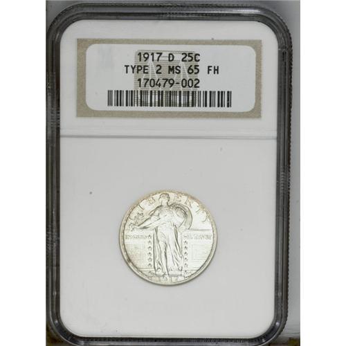 <B>1917-D<25C> Type Two MS65 Full Head NGC.</B></I> A conditionally scarce D-mint issue, this lovely Gem is lightly toned in golden iridescence. The satiny surfaces have a fine granular texture. The strike is razor-sharp, except over the date, and since only approximately 10% of this issue was adequately impressed, the crisp definition over Liberty's head is easily this coin's most impressive feature. There are no abrasions that would call into question the assigned grade. Census: 27 in 65, 6 finer (4/06).