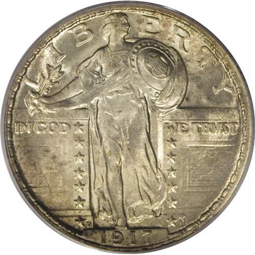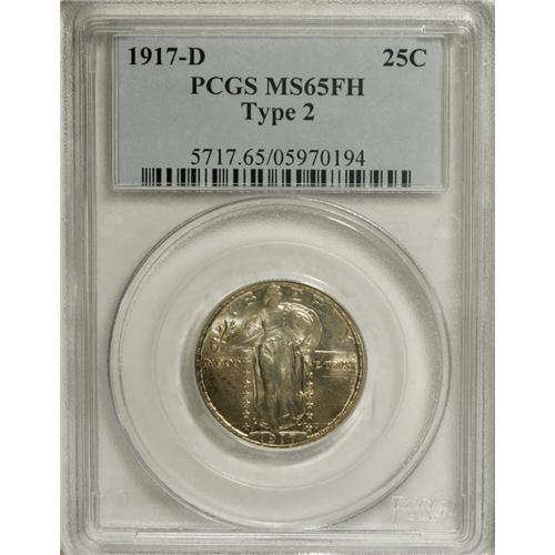 <B>1917-D 25C Type Two MS65 Full Head PCGS.</B></I> Autumn-gold graces this splendidly smooth and lustrous Gem. Well stuck except for the usual softness on the pair of rivets near the Liberty's waist. Scarcer than the 1917-D Type One and the 1917 Type Two. Population: 52 in 65 Full Head, 17 finer (2/07).<BR><BR><b>Shipping:</b> Coins & Currency (<a target="_blank" href="http://www.heritageauctions.com/common/shipping.php">view shipping information</a>)