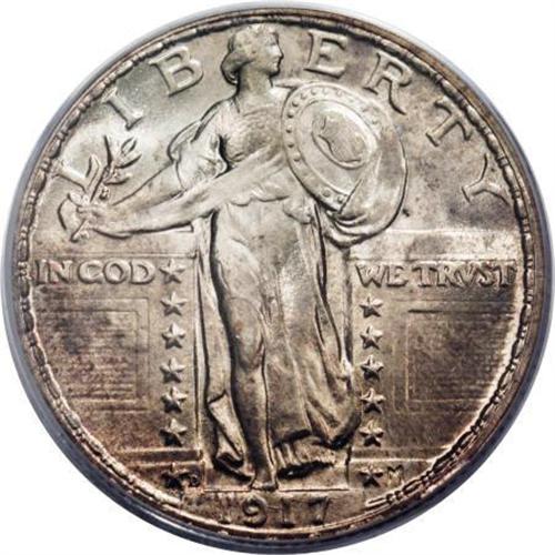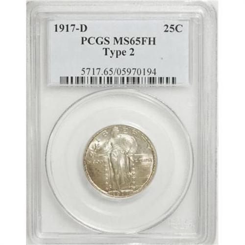 <B>1917-D 25C Type Two MS65 Full Head PCGS.</B></I> Autumn-gold and lavender coloration graces this splendidly smooth and highly lustrous Gem quarter. Well stuck except for the usual softness on the pair of rivets near Liberty's waist. Scarcer than the 1917-D Type One and the 1917 Type Two. Population: 54 in 65 Full Head, 17 finer (11/07). <BR><I>From The Hoffy Collection, NGC's #3 Registry Collection of Standing Liberty Quarters.</B></I><BR><BR><B>Coin Engraver:</B> Hermon A. MacNeil<BR><BR><b>Shipping:</b> Coins & Currency (<a target="_blank" href="http://www.heritageauctions.com/common/shipping.php">view shipping information</a>)