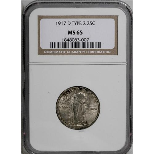 <B>1917-D<25C> Type Two MS65 NGC.</B></I> Lavender-gray, toned darkly in spots near the rim, with good luster. A nicely struck Gem without major distractions. Census: 33 in 65, 16 finer (6/06).<BR><I>Ex: Henry Pirtle Collection (Stack's, 4/53), lot 786.</B></I><BR><I>From The Redfjord Collection.</B></I>