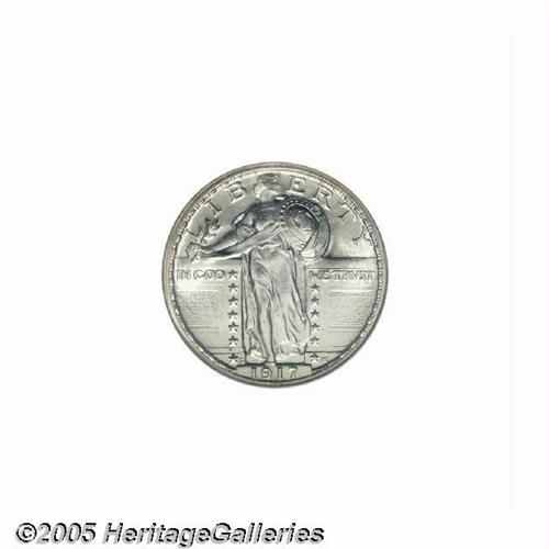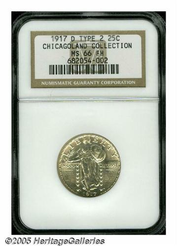 <B>1917-D<25C> Type Two MS66 Full Head NGC.</B></I> Ex: Chicagoland Collection. Untoned save for a whisper of golden patina at the outermost borders, with uncanny vibrancy to the matte-like surfaces. Although well produced and struck in substantial quantities (over 6 million pieces), relatively few Superb examples survive of this second year Denver issue. Population: 4 in 66, 1 finer (6/05).