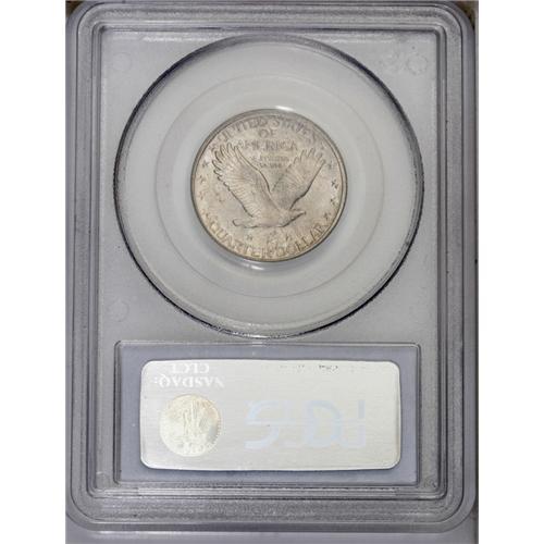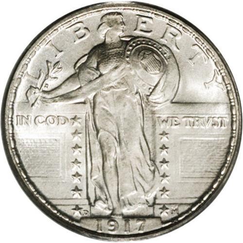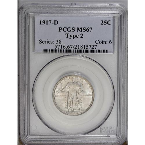 <B>1917-D<25C> Type Two MS67 PCGS.</B></I> Intensely lustrous with lightly toned surfaces showing hints of rose and ice-blue color. Quite well struck overall, displaying at least 75 percent of Liberty's head detail. To date, this is the single finest '17-D Type Two quarter certified by PCGS without a Full Head.