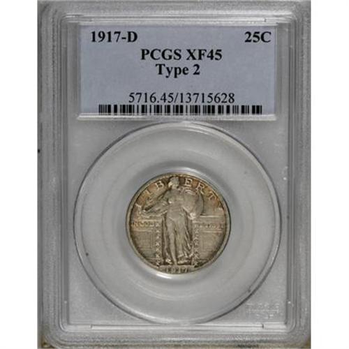 <B>1917-D 25C Type Two XF45 PCGS.</B></I> PCGS Population (8/498). NGC Census: (2/352). Mintage: 6,224,400. Numismedia Wsl. Price for NGC/PCGS coin in XF45: $96. (#5716)<BR><BR><B>Coin Engraver:</B> Hermon A. MacNeil<BR><BR><b>Shipping:</b> Coins & Currency (<a target="_blank" href="http://www.heritageauctions.com/common/shipping.php">view shipping information</a>)