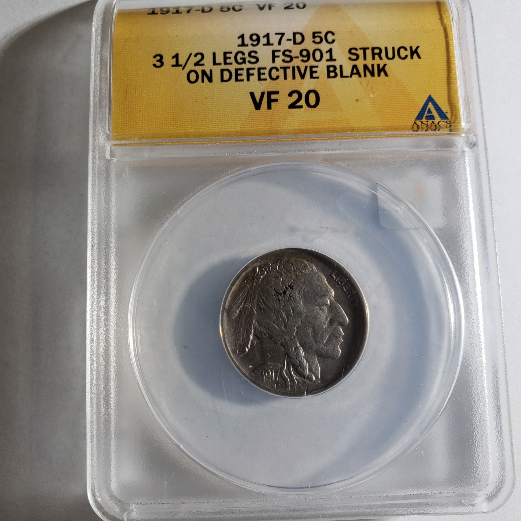1917-D 3 1/2 Leg Buffalo Double Errors Grade: ANACS VF-20