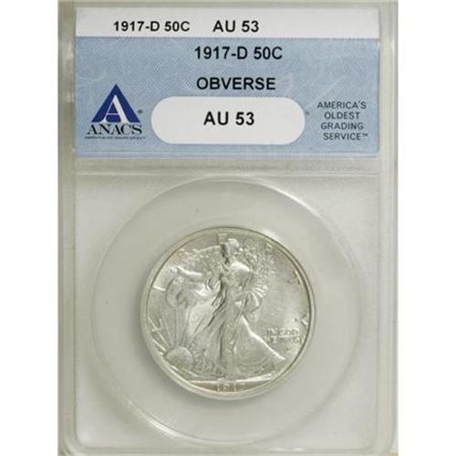 <B>1917-D 50C Obverse AU53 ANACS.</B></I> NGC Census: (8/603). PCGS Population (21/715). Mintage: 765,400. Numismedia Wsl. Price for NGC/PCGS coin in AU53: $335. (#6570)<BR><BR><B>Coin Engraver:</B> Adolph A. Weinman<BR><BR><b>Shipping:</b> Coins & Currency (<a target="_blank" href="http://www.heritageauctions.com/common/shipping.php">view shipping information</a>)