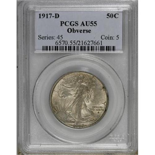 <B>1917-D 50C Obverse AU55 PCGS.</B></I> PCGS Population (63/652). NGC Census: (30/573). Mintage: 765,400. Numismedia Wsl. Price for NGC/PCGS coin in AU55: $400. (#6570)<BR><BR><B>Coin Engraver:</B> Adolph A. Weinman<BR><BR><b>Shipping:</b> Coins & Currency (<a target="_blank" href="http://www.heritageauctions.com/common/shipping.php">view shipping information</a>)