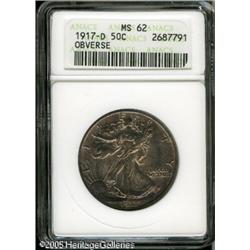 <B>1917-D 50C Obverse MS62 ANACS.</B></I> A delicate mix of mauve and light gold patina, and sharply struck devices. A few minute marks are noted on Liberty's lower skirt and in the left reverse field. Lot:7928