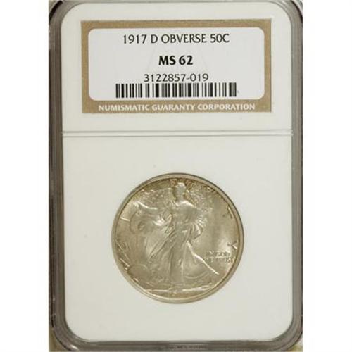 <B>1917-D 50C Obverse MS62 NGC.</B></I> Soft, swirling luster enlivens the moderately toned silver-gray and green-gold surfaces of this Obverse 1917-D half. Well struck overall with a modicum of definition at the centers.<BR><BR><B>Coin Engraver:</B> Adolph A. Weinman<BR><BR><b>Shipping:</b> Coins & Currency (<a target="_blank" href="http://www.heritageauctions.com/common/shipping.php">view shipping information</a>)