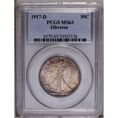 <B>1917-D<50C> Obverse MS63 PCGS.</B></I> The lavish toning on both sides of this lustrous example is strongly suggestive of originality. Deep purple and cobalt-blue coloration complements the underlying smoky gray patina. The piece is well struck with just two or three grade-limiting marks on each side. An eagerly sought-out type coin because of the obverse mintmark, found only on halves of 1916 and 1917. <BR><BR><B>Important notice:</B> Heritage usually auctions material at the rate of 200-250 lots per hour. On some occasions eBay Live bid software or the Internet may not be able to keep up with the pace of the auction. We recommend placing a realistic absentee bid now as insurance to avoid disappointment. Occasionally the auctioneer may eliminate or reject an eBay Live bid, and the auctioneer may also reopen a lot after the close of the eBay live bidding (usually because we missed an audience bid), and may reject your bid even if it shows you as the winning bidder. By bidding via eBay Live, you agree that Heritage may award the lot to another bidder at its sole discretion under the circumstances described above or any other reasonable circumstances. Since eBay bids are not shown to us until we open the lot on the floor, we treat those bids just like floor bids. In most cases the floor responds before the eBay bid is presented to us, due to Internet lag time, so for consistency we have made it a policy that floor bids are always considered first over tie eBay live bids. Also please note that all Heritage lots purchased through eBay Live carry a 20% Buyer's Premium. Please make sure you read the Terms and Conditions before you bid. This lot is being auctioned in conjunction with a live floor auction by Heritage Galleries & Auctioneers. All final auction and invoice information will be supplied by Heritage Galleries & Auctioneers, and all other information should be considered preliminary. Lot:2910 <BR><BR><B>Winning Notification and Billing:</B> After the FINAL session in this auction is complete, Heritage will send e-mail and snail mail invoices. This process normally takes several days. All final auction and invoice information will be supplied by Heritage Galleries & Auctioneers, and all other information should be considered preliminary. <BR><BR>This auction will be conducted on a live auction floor and over the Internet through eBay Live. If you choose to place an absentee bid, please take a moment to <font color='#0000ff'><u><a href='http://pages.ebay.com/liveauctions/help/before/laabsentee.html'>learn how eBay Live absentee bidding works</a></u></font><font color='#000000'>