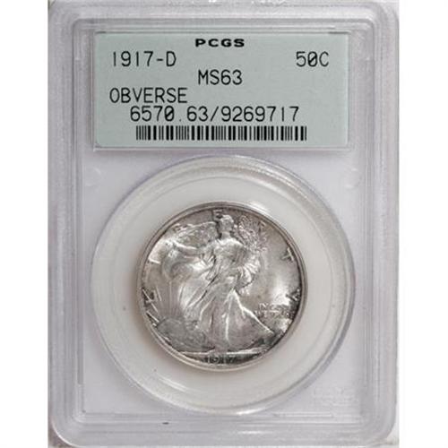 <B>1917-D 50C Obverse MS63 PCGS.</B></I> A well-defined example of the short-lived Obverse Mintmark variety, lightly toned blue-gray overall with deeper violet color present at the rims. This Select piece has a few light abrasions on Liberty's lower skirt.<BR><BR><b>Shipping:</b> Coins & Currency (<a target="_blank" href="http://www.heritageauctions.com/common/shipping.php">view shipping information</a>)