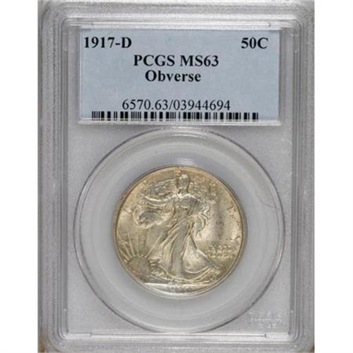 <B>1917-D 50C Obverse MS63 PCGS.</B></I> Lustrous and boldly struck with a faint golden cast and a slight degree of speckled russet patina near the borders. A brief type with the mintmark on the obverse that was only produced in 1916 and for part of 1917. <BR><BR><b>Shipping:</b> Coins & Currency (<a target="_blank" href="http://www.heritageauctions.com/common/shipping.php">view shipping information</a>)