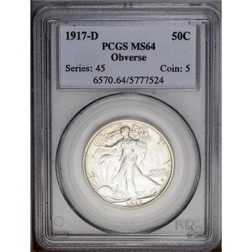 <B>1917-D<50C> Obverse MS64 PCGS.</B></I> A well struck example of this obverse mintmark half dollar. The surfaces are bright and have more of a frosted appearance than the expected satin finish that is usually seen. Mostly brilliant, there is just the slightest hint of golden color around the margins. Lightly abraded, as expected. <BR><BR><B>Important notice:</B> Heritage usually auctions material at the rate of 200-250 lots per hour. On some occasions eBay Live bid software or the Internet may not be able to keep up with the pace of the auction. We recommend placing a realistic absentee bid now as insurance to avoid disappointment. Occasionally the auctioneer may eliminate or reject an eBay Live bid, and the auctioneer may also reopen a lot after the close of the eBay live bidding (usually because we missed an audience bid), and may reject your bid even if it shows you as the winning bidder. By bidding via eBay Live, you agree that Heritage may award the lot to another bidder at its sole discretion under the circumstances described above or any other reasonable circumstances. Since eBay bids are not shown to us until we open the lot on the floor, we treat those bids just like floor bids. In most cases the floor responds before the eBay bid is presented to us, due to Internet lag time, so for consistency we have made it a policy that floor bids are always considered first over tie eBay live bids. Also please note that all Heritage lots purchased through eBay Live carry a 20% Buyer's Premium. Please make sure you read the Terms and Conditions before you bid. This lot is being auctioned in conjunction with a live floor auction by Heritage Galleries & Auctioneers. All final auction and invoice information will be supplied by Heritage Galleries & Auctioneers, and all other information should be considered preliminary. Lot:2911 <BR><BR><B>Winning Notification and Billing:</B> After the FINAL session in this auction is complete, Heritage will send e-mail and snail mail invoices. This process normally takes several days. All final auction and invoice information will be supplied by Heritage Galleries & Auctioneers, and all other information should be considered preliminary. <BR><BR>This auction will be conducted on a live auction floor and over the Internet through eBay Live. If you choose to place an absentee bid, please take a moment to <font color='#0000ff'><u><a href='http://pages.ebay.com/liveauctions/help/before/laabsentee.html'>learn how eBay Live absentee bidding works</a></u></font><font color='#000000'>