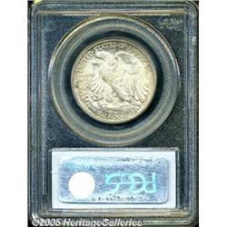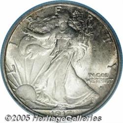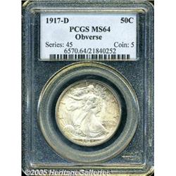 <B>1917-D 50C Obverse MS64 PCGS.</B></I> Although not as rare as the 1917-S Obverse variety, the 1917-D does possess a moderately lower mintage, which ranks among the lowest issues in the series since only 765,400 pieces were struck. Lightly toned in mottled purple and cream-gray colors, this shimmering near-Gem features a crisp strike and a well preserved reverse. The obverse devices are also clean, and only a couple of tiny ticks in the right field deny a finer assessment.