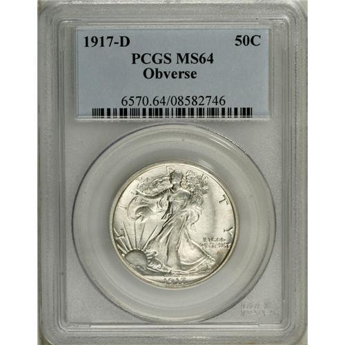 <B>1917-D 50C Obverse MS64 PCGS.</B></I> Choice and highly lustrous with a splash of charcoal-gray near the right reverse rim. Liberty's thumb is sharp, though the ever-present weakness on the eagle's leg is just that.<BR><BR><b>Shipping:</b> Coin/Currency (<a target="_blank" href="http://www.heritageauctions.com/common/shipping.php">view shipping information</a>)