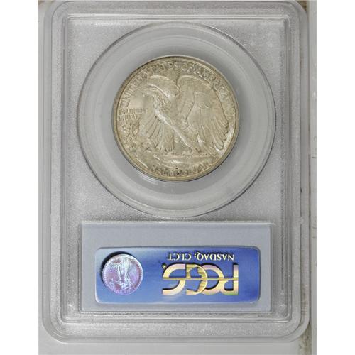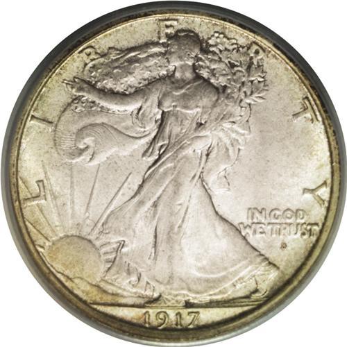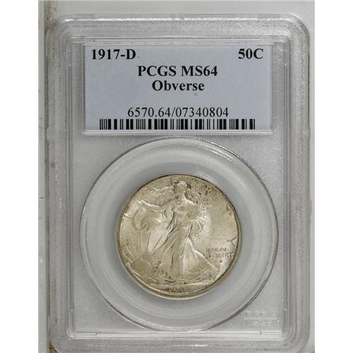 <B>1917-D<50C> Obverse MS64 PCGS.</B></I> Dappled tan and battleship-gray toning confirms the originality of this satiny and sharply struck near-Gem. The obverse is well preserved, and reverse marks are nearly absent aside from minor ticks on the wingtips. Only 765,400 half dollars were struck at Denver in 1917, prior to the transfer of the mintmark to the reverse.