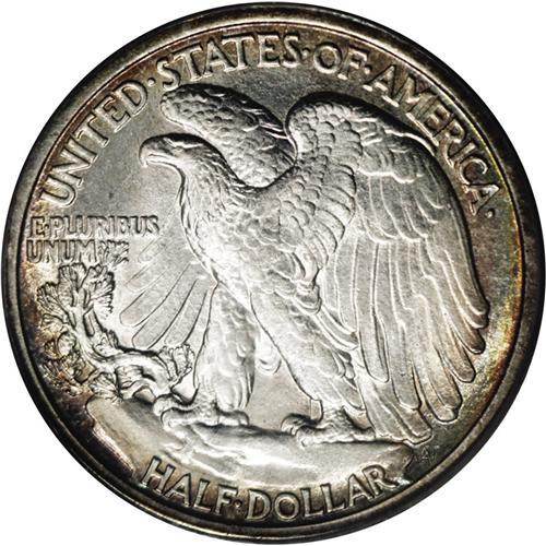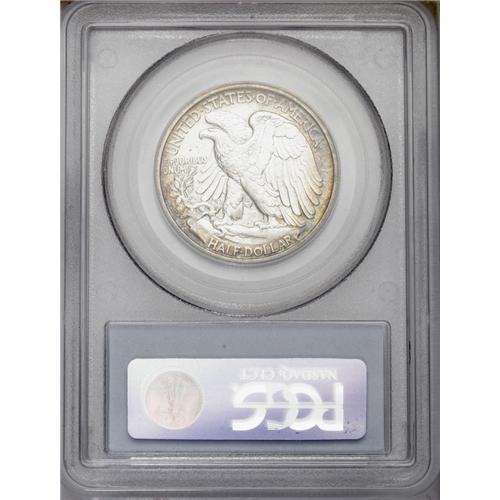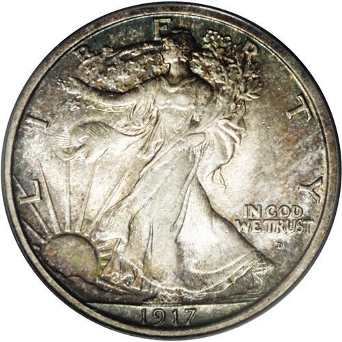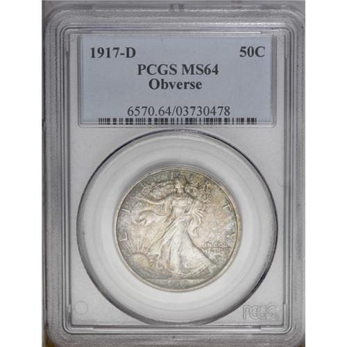 <B>1917-D<50C> Obverse MS64 PCGS.</B></I> Golden-brown, lilac, and aquamarine dominate the obverse and enrich the reverse periphery. This lustrous and crisply struck near-Gem has a pleasing reverse and a carefully preserved obverse. A transitional year for the mintmark location. The 1917-D obverse mintmark variety has one of the lower productions of the series, 765,400 pieces.