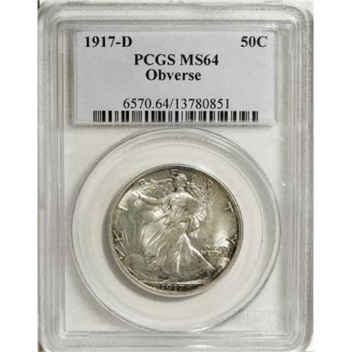 <B>1917-D 50C Obverse MS64 PCGS.</B></I> The obverse mintmark placement on Walker halves lasted for just two issues, and the majority of mintmarked 1917 halves are of the reverse variety. This well-defined Choice piece is largely silver-gray with splashes of brick-red, cobalt, and olive-tan at the margins.<BR><BR><B>Coin Engraver:</B> Adolph A. Weinman<BR><BR><b>Shipping:</b> Coins & Currency (<a target="_blank" href="http://www.heritageauctions.com/common/shipping.php">view shipping information</a>)