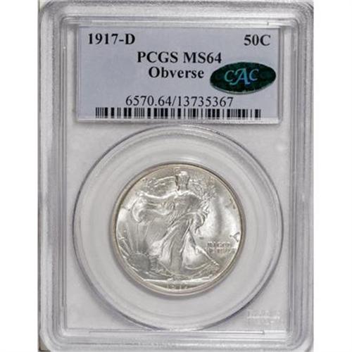 <B>1917-D 50C Obverse MS64 PCGS. CAC.</B></I> Strongly lustrous for the issue with above-average definition, including a measure of detail on the branch hand. An attractive representative of the short-lived Obverse Mintmark type. PCGS has graded 63 finer pieces (11/07).<BR><BR><B>Coin Engraver:</B> Adolph A. Weinman<BR><BR><b>Shipping:</b> Coins & Currency (<a target="_blank" href="http://www.heritageauctions.com/common/shipping.php">view shipping information</a>)