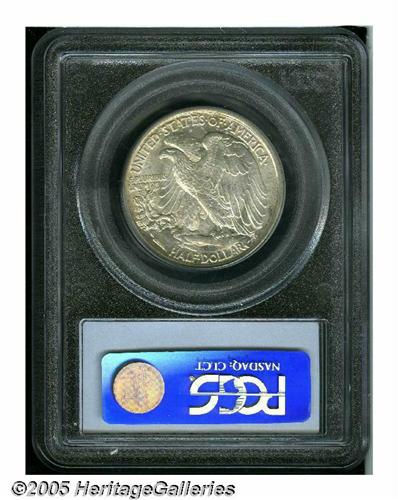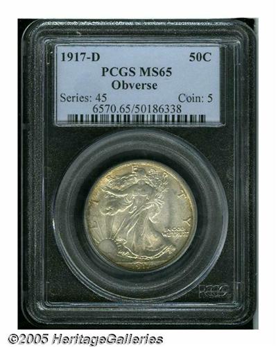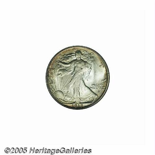 <B>1917-D<50C> Obverse MS65 PCGS.</B></I> A scarce early Walker with the popular obverse mintmark. Frosted mint luster covers both sides with a satiny texture to the coin overall. Mostly brilliant except for a ring of reddish-golden patina surrounding the perimeters. Well struck on the obverse with minimal softness on the reverse. Population: 58 in 65, 4 finer (5/05).