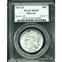 <B>1917-D<50C> Obverse MS65 PCGS.</B></I> A satiny Gem that has a hint of tan patina across the predominately cream-gray surfaces. Beautifully preserved and suitably struck. The mintmarked moved to the reverse relatively early in 1917, and the obverse mintmark variety has a considerably lower mintage than its reverse mintmark counterpart. Most Uncirculated survivors are in MS62 to MS64 grades. Full Gems are rare, and are always in demand from specialists of this popular series. <BR><BR><B>Important notice:</B> Heritage usually auctions material at the rate of 200-250 lots per hour. On some occasions eBay Live bid software or the Internet may not be able to keep up with the pace of the auction. We recommend placing a realistic absentee bid now as insurance to avoid disappointment. Occasionally the auctioneer may eliminate or reject an eBay Live bid, and the auctioneer may also reopen a lot after the close of the eBay live bidding (usually because we missed an audience bid), and may reject your bid even if it shows you as the winning bidder. By bidding via eBay Live, you agree that Heritage may award the lot to another bidder at its sole discretion under the circumstances described above or any other reasonable circumstances. Since eBay bids are not shown to us until we open the lot on the floor, we treat those bids just like floor bids. In most cases the floor responds before the eBay bid is presented to us, due to Internet lag time, so for consistency we have made it a policy that floor bids are always considered first over tie eBay live bids. Also please note that all Heritage lots purchased through eBay Live carry a 20% Buyer's Premium. Please make sure you read the Terms and Conditions before you bid. </span></font></tr></table></td></tr></table>