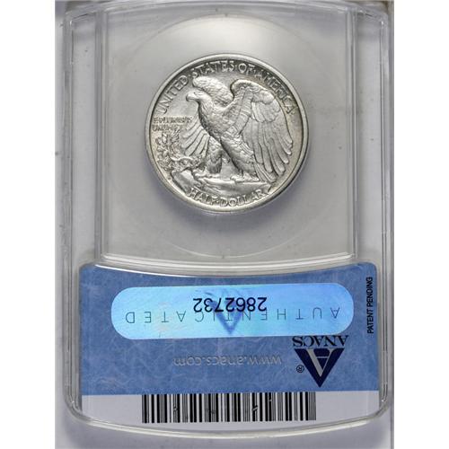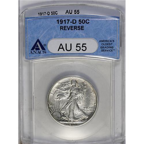 <B>1917-D<50C> Reverse AU55 ANACS.</B></I> Well struck and untoned, this Choice AU example is nearly free of surface blemishes and the degree of highpoint wear on either side seems appropriate for the assigned grade level. The fields show an interestingly grainy, matte-like texture which is somewhat unusual and not at all unattractive.