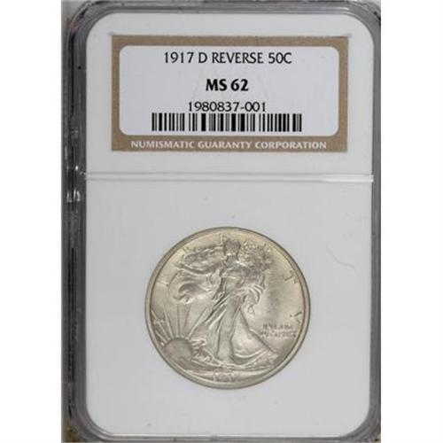<B>1917-D 50C Reverse MS62 NGC.</B></I> In 1916 and briefly in 1917, branch mint Walker halves had their mintmarks on the obverse, but in February, the location changed to the reverse. This gold-tinged, slightly satiny example has few marks for the grade and pleasing detail on the branch hand.<BR><BR><B>Coin Engraver:</B> Adolph A. Weinman<BR><BR><b>Shipping:</b> Coins & Currency (<a target="_blank" href="http://www.heritageauctions.com/common/shipping.php">view shipping information</a>)