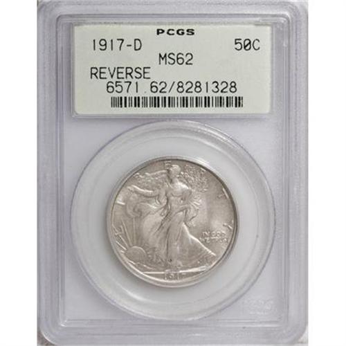 <B>1917-D 50C Reverse MS62 PCGS.</B></I> Hazy gold-gray patina graces the luminous surfaces of this unworn and pleasing piece. A single spot of deeper color appears just above Liberty's front foot. Despite having a higher mintage than its Obverse Mintmark counterpart, this issue has a mintage of under 2 million pieces.<BR><BR><b>Shipping:</b> Coins & Currency (<a target="_blank" href="http://www.heritageauctions.com/common/shipping.php">view shipping information</a>)