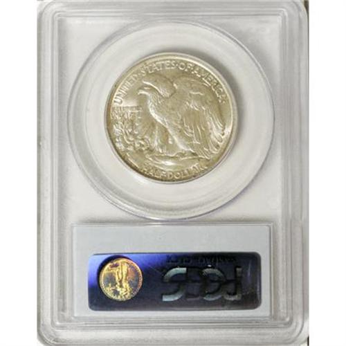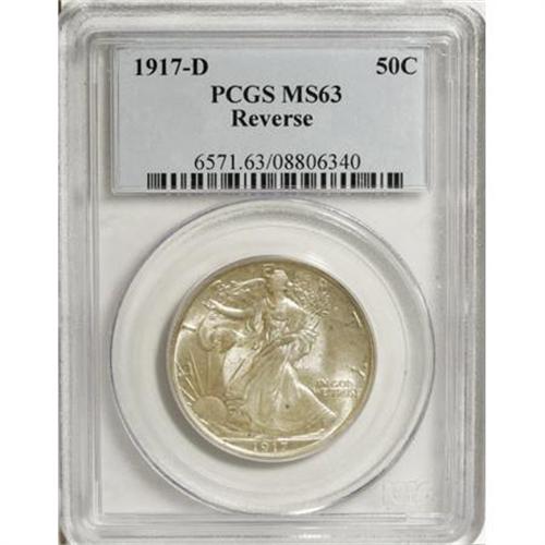 <B>1917-D 50C Reverse MS63 PCGS.</B></I> The position of the mintmark on this type was shifted from the obverse to the reverse, early enough in the year 1917 that considerably more of the Reverse coins were produced. For unknown reasons, however, the Reverse variety is scarcer in Mint State than the Obverse variety. This example is softly struck on Liberty's head and branch hand, with soft satin luster and light, creamy-beige coloration. A few minor marks and a small gray spot, on Liberty's lower skirt area, limit the grade.<BR><BR><B>Coin Engraver:</B> Adolph A. Weinman<BR><BR><b>Shipping:</b> Coins & Currency (<a target="_blank" href="http://www.heritageauctions.com/common/shipping.php">view shipping information</a>)