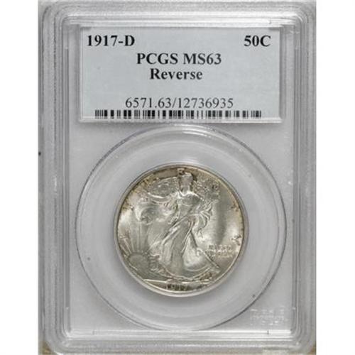 <B>1917-D 50C Reverse MS63 PCGS.</B></I> Soft, swirling luster enlivens each side of this Select coin, and splashes of rose-violet toning grace the margins. Well struck for the issue, though Liberty's branch hand shows only slight definition.<BR><BR><B>Coin Engraver:</B> Adolph A. Weinman<BR><BR><b>Shipping:</b> Coins & Currency (<a target="_blank" href="http://www.heritageauctions.com/common/shipping.php">view shipping information</a>)