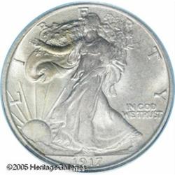 <B>1917-D 50C Reverse MS64 PCGS.</B></I> A very sharply struck example of this early strike rarity in the Walker series. Well defined throughout, there is only the slightest softness evident on Liberty's head. Rich satiny mint luster overlays each side with alternating streaks of golden and lilac toning and a brilliant center on the reverse. Population: 111 in 64, 36 finer (1/05). Lot:7936