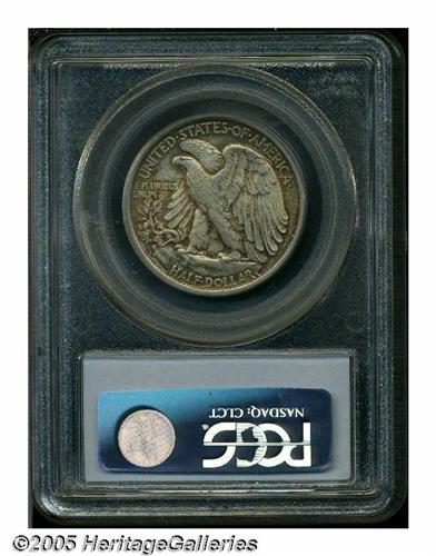 <B>1917-D<50C> Reverse MS64 PCGS.</B></I> On February 14, 1917, a policy change by Mint Director F.J.H. von Engelken caused the mintmark to be moved from its conspicuous obverse prominence to a more obscure reverse location where it remained for Denver and San Francisco issues until 1947, the final year for the Walking Liberty half dollar. Although more were minted in 1917 with the mintmark on the reverse, very few were saved from circulation, hence, the conditional rarity of this piece. The '17-D Reverse is also a strike rarity among early Walkers, but this coin is well defined on the obverse and shows good definition on the eagle on the reverse. Moderately toned overall, the slightly muted steel-gray surfaces are enhanced with mottled brick-red shadings in the protected areas. Population: 110 in 64, 35 finer (5/05).