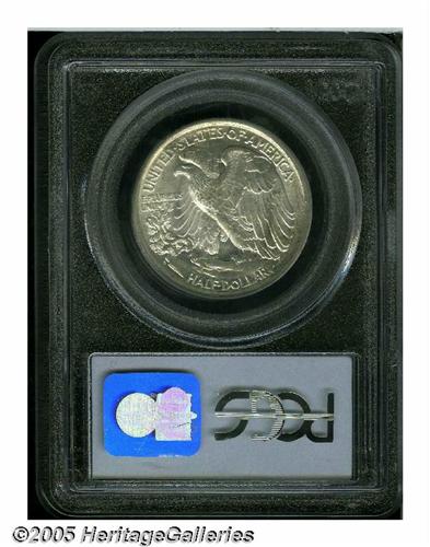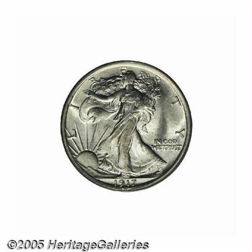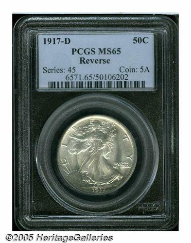 <B>1917-D<50C> Reverse MS65 PCGS.</B></I> This coin boasts one of the sharper strikes that this cataloger has seen on a 1917-D Half Dollar with the mintmark on the reverse. Liberty's right (facing) hand on the obverse and the central breast feathers on the reverse eagle are as close to full as one should expect for the date, and even Liberty's head exhibits emerging definition. Full mint luster blankets both sides with a snow-white appearance. With few abrasions of any size, and none that are outwardly distracting, this coin is knocking on the door of a premium quality Gem grade. The combination of sharp details, brilliant luster, and unblemished surfaces is hard to beat.<BR> The 1917-D Reverse was produced in greater numbers (1.9 million coins vs. 765,400 pieces) than its similarly dated Obverse mintmark counterpart. Fewer examples of the former variety were saved, however, and the '17-D Reverse has long been heralded as one of the great condition rarities from the initial years of Walking Liberty Half Dollar production. Population: 30 in 65, 5 finer (6/05).<BR><I>From The Robert Moreno Collection.</B></I>