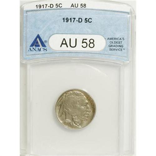 <B>1917-D 5C AU58 ANACS.</B></I> NGC Census: (70/426). PCGS Population (83/673). Mintage: 9,910,000. Numismedia Wsl. Price for NGC/PCGS coin in AU58: $225. (#3935)<BR><BR><B>Coin Engraver:</B> James E. Fraser<BR><BR><b>Shipping:</b> Coins & Currency (<a target="_blank" href="http://www.heritageauctions.com/common/shipping.php">view shipping information</a>)