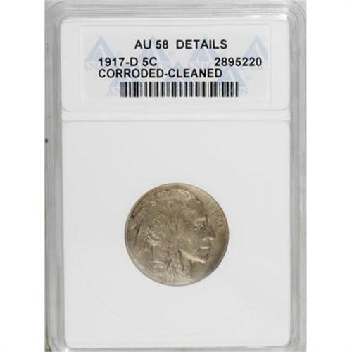 <B>1917-D 5C --Cleaned, Corroded--ANACS. AU58 Details.</B></I> NGC Census: (71/430). PCGS Population (83/678). Mintage: 9,910,000. Numismedia Wsl. Price for NGC/PCGS coin in AU58: $225. (#3935)<BR><BR><B>Coin Engraver:</B> James E. Fraser<BR><BR><b>Shipping:</b> Coins & Currency (<a target="_blank" href="http://www.heritageauctions.com/common/shipping.php">view shipping information</a>)