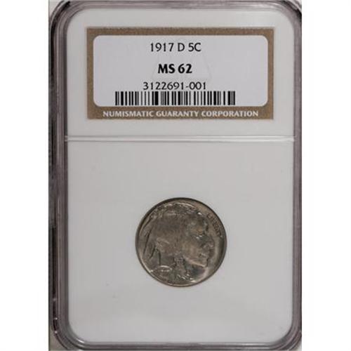 <B>1917-D 5C MS62 NGC.</B></I> NGC Census: (80/327). PCGS Population (54/613). Mintage: 9,910,000. Numismedia Wsl. Price for NGC/PCGS coin in MS62: $440. (#3935)<BR><BR><B>Coin Engraver:</B> James E. Fraser<BR><BR><b>Shipping:</b> Coins & Currency (<a target="_blank" href="http://www.heritageauctions.com/common/shipping.php">view shipping information</a>)
