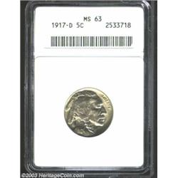 <TABLE cellSpacing=0 cellPadding=0 width="100%" bgColor=#000000 border=0><TBODY><TR><TD width="100%"><TABLE cellSpacing=1 cellPadding=3 width="100%" border=0><TBODY><TR><TD width="100%" bgColor=#79735c><FONT face=arial color=#ffffff size=3><B>Description</B> </FONT></TD></TR><TR><TD width="100%" bgColor=#ffffff><FONT face=arial size=2><B>1917-D 5C MS63 ANACS.</B></I> Apple-green and lilac-mauve colors endow this satiny Mint State Nickel. The legends are bold aside from the date, although the fields have an orange peel texture to the late die state. </FONT></TD></TR></TBODY></TABLE></TD></TR></TBODY></TABLE><BR><A name=PricesRealized></A><TABLE cellSpacing=0 cellPadding=0 width="100%" bgColor=#000000 border=0><TBODY><TR><TD width="100%"><TABLE cellSpacing=1 cellPadding=3 width="100%" border=0><TBODY><TR><TD width="100%" bgColor=#79735c><A name=PR><FONT face=arial color=#ffffff size=3><B>Previous Prices from Heritage Auctions</B> </FONT></A></TD></TR><TR><TD bgColor=#f6f6ed><TABLE cellSpacing=0 cellPadding=0 width="100%" border=1><TBODY><TR><TD align=middle width="33%"><B>Date</B></TD><TD align=middle width="33%"><B>Service</B></TD><TD align=middle width="33%"><B>Price</B></TD></TR><TR bgColor=whitesmoke><TD width="33%"><B>11/21/2000</B></TD><TD width="33%">PCGS</TD><TD width="33%">$490.00</TD></TR><TR bgColor=whitesmoke><TD width="33%"><B>06/06/1997</B></TD><TD width="33%">NGC</TD><TD width="33%">$402.50</TD></TR><TR bgColor=whitesmoke><TD width="33%"><B>01/13/2002</B></TD><TD width="33%">ANACS</TD><TD width="33%">$540.50</TD></TR><TR bgColor=whitesmoke><TD width="33%"><B>03/04/1994</B></TD><TD width="33%">PCGS</TD><TD width="33%">$440.00</TD></TR><TR bgColor=whitesmoke><TD width="33%"><B>09/23/1998</B></TD><TD width="33%">NGC</TD><TD width="33%">$495.00</TD></TR><TR bgColor=whitesmoke><TD width="33%"><B>05/31/2003</B></TD><TD width="33%">ANACS</TD><TD width="33%">$805.00</TD></TR></TBODY></TABLE></TD></TR><TR><TD bgColor=#ffffff><FONT face=arial size=1 ?>PLEASE NOTE: All prices realized reflect the final hammer price PLUS the buyer's premium in auctions that charge a buyer's premium. Each item has a notation at the top of the listing indicating whether that lot included a buyer's premium. Example: A item that sells with a final hammer price of $100 and a 20% buyer's premium will display with a price realized of $120. All information listed is intended to be as accurate as possible, but errors are possible. Please use this guide carefully and inform us of any inaccuracies. </FONT></TD></TR></TBODY></TABLE></TD></TR></TBODY></TABLE><BR><TABLE cellSpacing=0 cellPadding=0 width="100%" bgColor=#000000 border=0><TBODY><TR><TD width="100%"><TABLE cellSpacing=1 cellPadding=3 width="100%" border=0><TBODY><TR><TD width="100%" bgColor=#79735c colSpan=6><FONT face=arial color=#ffffff size=3><B>Price Guide*</B> </FONT></TD></TR><TR bgColor=#f6f6ed><TD align=middle><B>Grade</B> </TD><TD align=middle><B>Coin World<BR>(Trends)</B> </TD><TD align=middle><B>Numismedia<BR>Retail</B> </TD><TD align=middle><B>Numismedia<BR>Wholesale</B> </TD><TD align=middle><B>Coin<BR>Universe</B> </TD><TD align=middle><B>Heritage<BR>Value Index</B> </TD></TR><TR bgColor=#ffffff><TD align=middle>62</TD><TD align=right>$500.00</TD><TD align=right>$550.00</TD><TD align=right>$440.00</TD><TD align=right>---</TD><TD align=right>$376.38</TD></TR><TR style="FONT-WEIGHT: bold" bgColor=#cccfdd><TD align=middle>63</TD><TD align=right>$700.00</TD><TD align=right>$680.00</TD><TD align=right>$540.00</TD><TD align=right>$685.00</TD><TD align=right>$516.13</TD></TR><TR bgColor=#ffffff><TD align=middle>64</TD><TD align=right>$1,265.00</TD><TD align=right>$880.00</TD><TD align=right>$700.00</TD><TD align=right>$1,000.00</TD><TD align=right>$728.25</TD></TR><TR bgColor=#ffffff><TD colSpan=6><FONT size=1>*All information listed is intended to be as accurate as possible, but errors are possible. No item may be returned or refused based on this information which is provided as a service to our customers. You should contact each pricing source directly to determine the accuracy of this information. </FONT></TD></TR></TBODY></TABLE></TD></TR></TBODY></TABLE><BR><TABLE cellSpacing=0 cellPadding=0 width="100%" bgColor=#000000 border=0><TBODY><TR><TD width="100%"><TABLE cellSpacing=1 cellPadding=3 width="100%" border=0><TBODY><TR><TD width="100%" bgColor=#79735c><FONT face=arial color=#ffffff size=3><B>Population Guide</B> </FONT></TD></TR><TR bgColor=#ffffff><TD align=middle><!-- Begin Output of Population Grid--><TABLE cellSpacing=0 cellPadding=0 width="100%" border=0><TBODY><TR><TD vAlign=center><TABLE cellSpacing=0 width="100%" border=1 cellsadding="3"><TBODY><TR><TD vAlign=center><TABLE cellSpacing=0 cellPadding=3 width="100%" border=1><TBODY><TR><TD vAlign=center align=middle bgColor=#f0f1e8 colSpan=2 <CENTER><FONT face=Arial size=2><B>PCGS Pop </B></FONT><CENTER></CENTER></TD><TD vAlign=center align=middle bgColor=#f0f1e8 colSpan=2><CENTER><FONT face=Arial size=2><B>NGC Pop</B></CENTER></FONT></TD></TR><TR><TD vAlign=center><FONT face=Arial size=2>(63)</FONT> </TD><TD vAlign=center align=right><FONT face=Arial size=2>140</FONT> </TD><TD vAlign=center><FONT face=Arial size=2>(63)</FONT> </TD><TD vAlign=center align=right><FONT face=Arial size=2>76</FONT> </TD></TR><TR><TD vAlign=center><FONT face=Arial size=2>(>63)</FONT> </TD><TD vAlign=center align=right><FONT face=Arial size=2>261</FONT> </TD><TD vAlign=center><FONT face=Arial size=2>(>63)</FONT> </TD><TD vAlign=center align=right><FONT face=Arial size=2>145</FONT> </TD></TR></TBODY></TABLE></TD></TR></TBODY></TABLE></TD></TR></TBODY></TABLE><!-- End Output of Population Grid--> Important notice: Heritage usually auctions material at the rate of 200-250 lots per hour. On some occasions eBay Live bid software or the Internet may not be able to keep up with the pace of the auction. We recommend placing a realistic absentee bid now as insurance to avoid disappointment. Occasionally the auctio