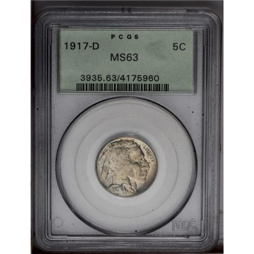 <B>1917-D<5C> MS63 PCGS.</B></I> Lightly abraded with excellent mint luster. A bit softly struck on the highpoints. <BR><BR><B>Important notice:</B> Heritage usually auctions material at the rate of 200-250 lots per hour. On some occasions eBay Live bid software or the Internet may not be able to keep up with the pace of the auction. We recommend placing a realistic absentee bid now as insurance to avoid disappointment. Occasionally the auctioneer may eliminate or reject an eBay Live bid, and the auctioneer may also reopen a lot after the close of the eBay live bidding (usually because we missed an audience bid), and may reject your bid even if it shows you as the winning bidder. By bidding via eBay Live, you agree that Heritage may award the lot to another bidder at its sole discretion under the circumstances described above or any other reasonable circumstances. Since eBay bids are not shown to us until we open the lot on the floor, we treat those bids just like floor bids. In most cases the floor responds before the eBay bid is presented to us, due to Internet lag time, so for consistency we have made it a policy that floor bids are always considered first over tie eBay live bids. Also please note that all Heritage lots purchased through eBay Live carry a 20% Buyer's Premium. Please make sure you read the Terms and Conditions before you bid. This lot is being auctioned in conjunction with a live floor auction by Heritage Galleries & Auctioneers. All final auction and invoice information will be supplied by Heritage Galleries & Auctioneers, and all other information should be considered preliminary. Lot:1050 <BR><BR><B>Winning Notification and Billing:</B> After the FINAL session in this auction is complete, Heritage will send e-mail and snail mail invoices. This process normally takes several days. All final auction and invoice information will be supplied by Heritage Galleries & Auctioneers, and all other information should be considered preliminary. <BR><BR>This auction will be conducted on a live auction floor and over the Internet through eBay Live. If you choose to place an absentee bid, please take a moment to <font color='#0000ff'><u><a href='http://pages.ebay.com/liveauctions/help/before/laabsentee.html'>learn how eBay Live absentee bidding works</a></u></font><font color='#000000'>