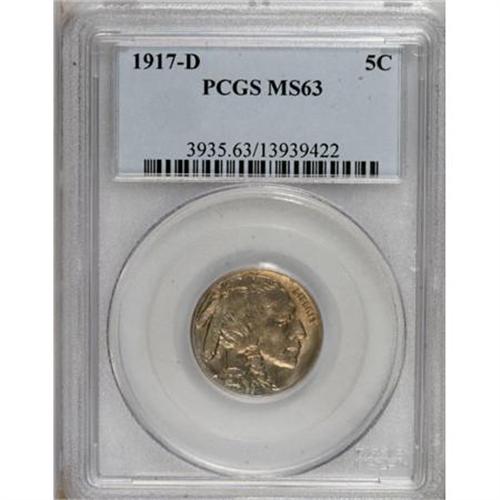 <B>1917-D 5C MS63 PCGS.</B></I> Lustrous and essentially untoned, with carefully preserved surfaces that are blemish-free on both sides. Slight weakness of detail on the highpoints of the bison may have limited the grade. <BR><BR><B>Coin Engraver:</B> James E. Fraser<BR><BR><b>Shipping:</b> Coins & Currency (<a target="_blank" href="http://www.heritageauctions.com/common/shipping.php">view shipping information</a>)