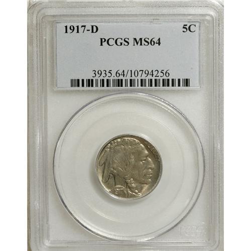 <B>1917-D 5C MS64 PCGS.</B></I> An above average strike is seen on this attractive, satiny coin. Lightly toned.<BR><BR><b>Shipping:</b> Coins & Currency (<a target="_blank" href="http://www.heritageauctions.com/common/shipping.php">view shipping information</a>)